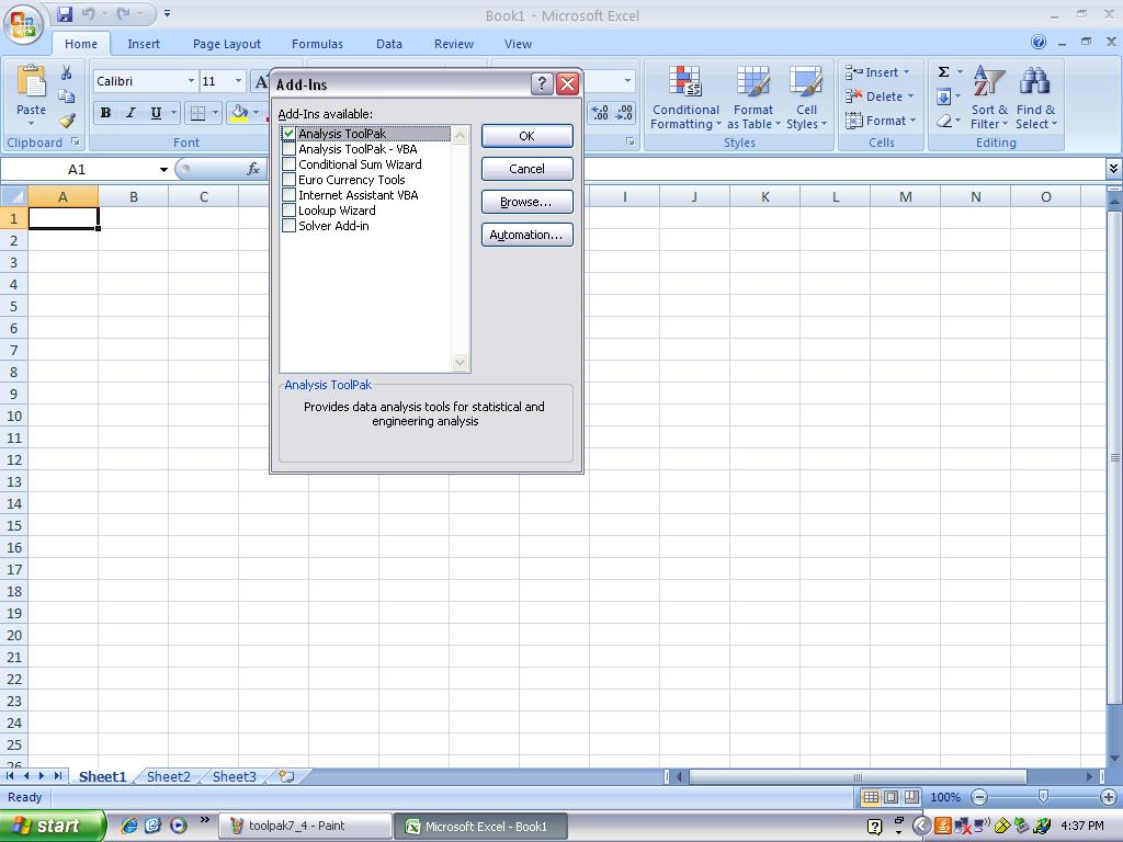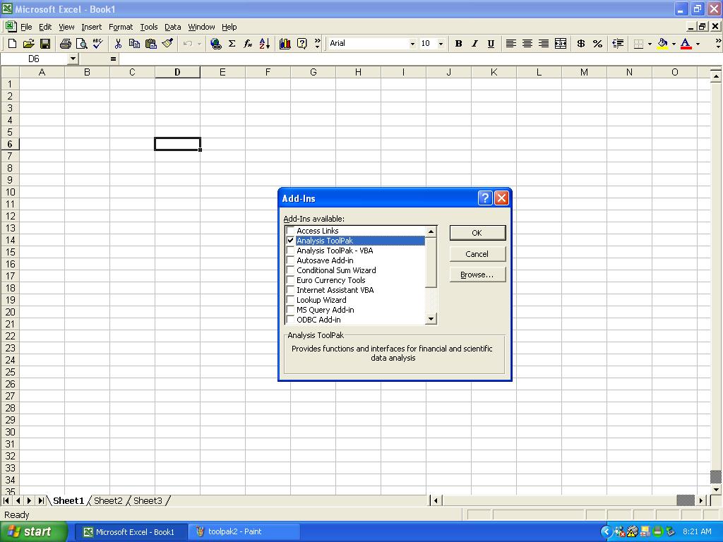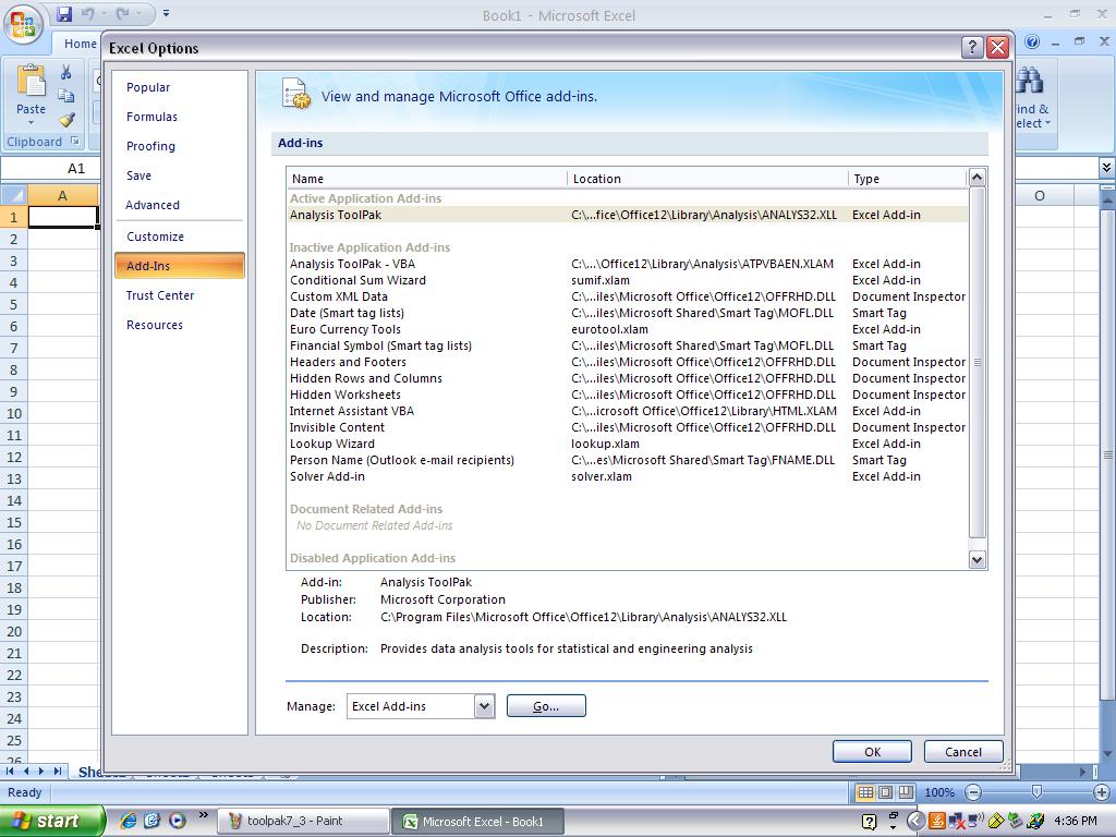 Select Add-Ins and from the dialog box, select Analysis ToolPak and press GO