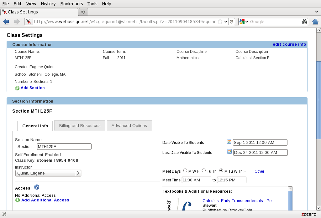 I have set up a course on Webassign for those who wish to make use of the electronic homework system provided by the publisher. Because you have to pay extra for it even if you have bought the text, I am giving you the option of using it or not using it. You can register for a free trial (12 days?) and see if you like it. You can do this at any time during the semester. The class key you need to register is in this screenshot. | |